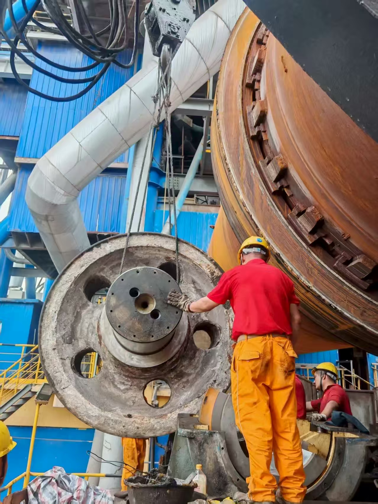 此外,施工团队还攻克了多项技术壁垒,如:应用"斜度保持工装"来确保施工过程窑体角度稳定;通过"动态调窑法"使窑体直线度达到最佳施工角度;4台500T液压千斤顶同步顶升,精度控制在微小范围内;施工团队创新采用"三同步"顶升技术,实现二挡三挡拖轮同步更换调整,将拖轮更换工期缩短至原时长的三分之二,创下行业新标杆;受限空间吊装技术成功突破20-30吨拖轮更换技术壁垒。