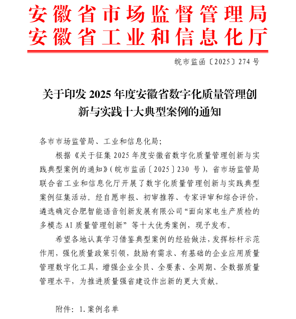 近日,安徽省市场监管管理局、安徽省工业和信息化厅发布“2025年安徽省数字化质量管理创新与实践十大典型案例”,瑞泰马钢申报的《借力“透明”智造,质领中国耐火》成功入选安徽省数字化质量管理创新与实践典型案例,也成为马鞍山唯一上榜案例。此次入选不仅彰显了企业创新引领地位,也是企业持续推动传统制造业数字赋能的重要成果。