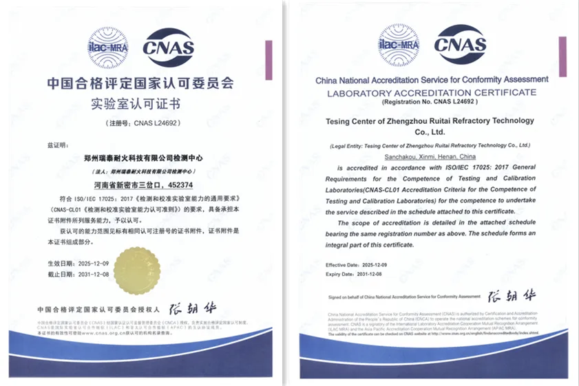 近日,郑州瑞泰耐火科技有限公司检测中心通过中国合格评定国家认可委员会严格评审,获得国家级实验室认可证书,证书注册号CNAS L24692。这标志着郑州瑞泰技术管理水平与实验检测能力已达到国家及国际标准化体系要求,其出具的检测报告将获得全球数十个互认国家的承认,在公信力与权威性上迈上了全新台阶。