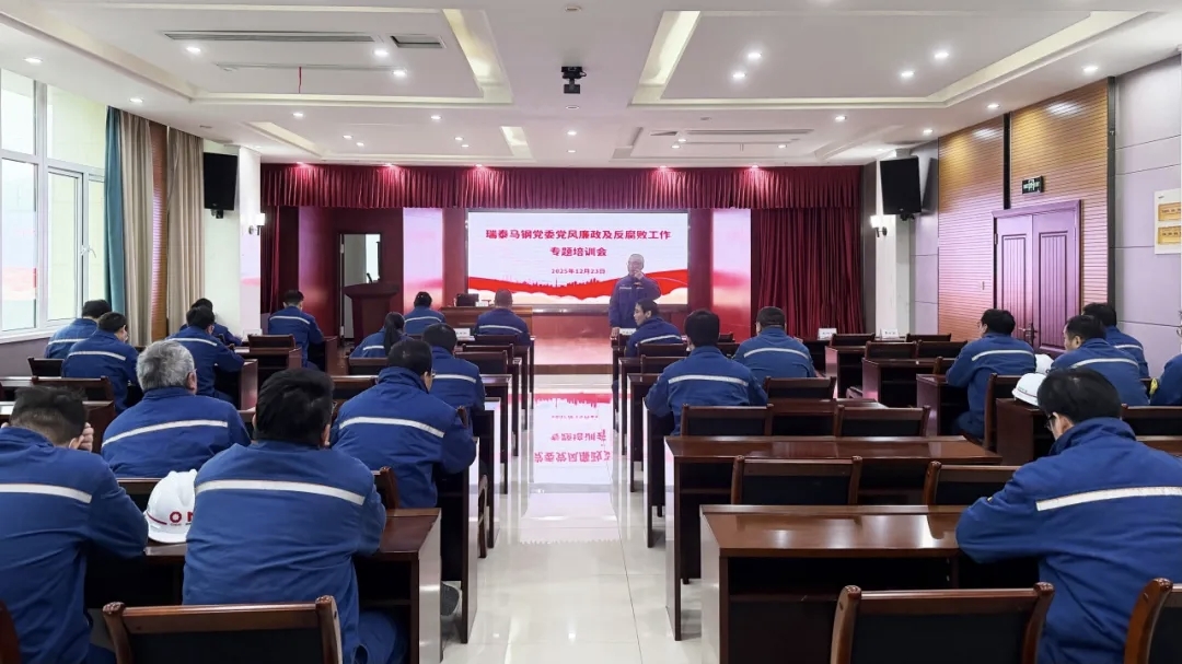 为深入贯彻全面从严治党战略方针,落实党中央关于党风廉政建设和反腐败工作的最新部署要求,根据《瑞泰马钢党委关于开展2025年党建工作系列培训的通知》相关工作计划,12月23日下午,瑞泰马钢党委召开党风廉政及反腐败工作专题培训会。会议邀请马钢有限炼铁厂(煤焦化公司)党委书记、副厂长章连生专题解读中央八项规定精神及实施细则。瑞泰马钢党委书记、总经理卢咏明主持培训会。