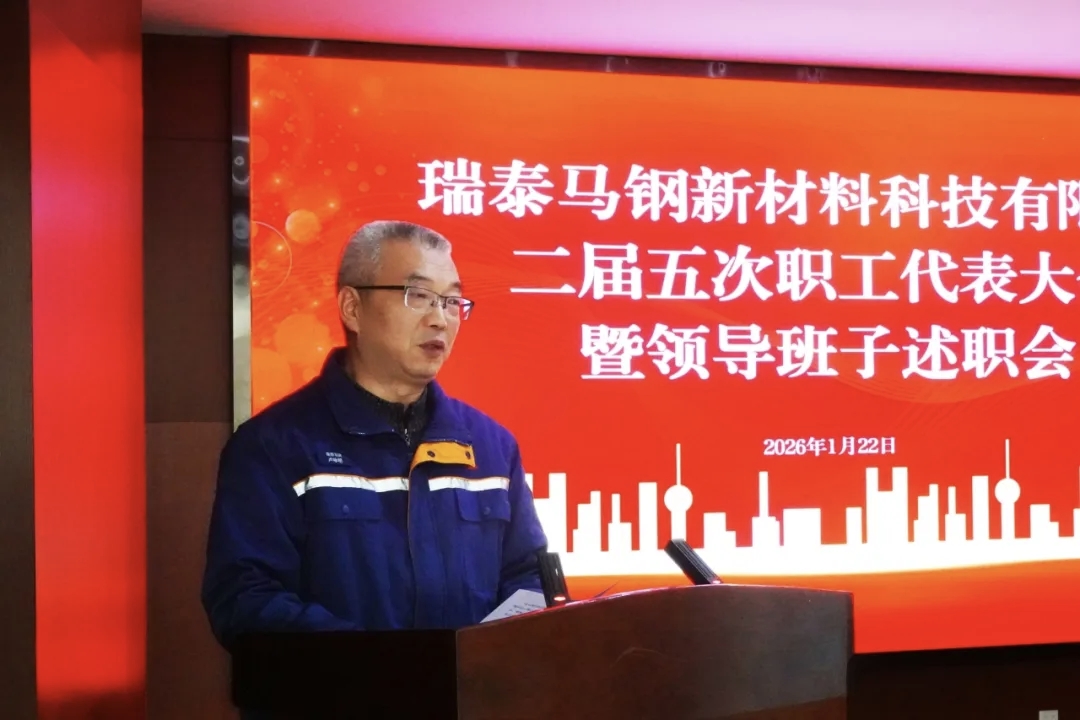 1月22日上午,瑞泰马钢召开二届五次职工代表大会暨领导班子述职会,全面学习贯彻集团、总院、总部相关会议精神,全面总结公司2025年各项工作,系统部署2026年重点工作任务。大会号召,全体员工要凝心聚力,全面落实公司职代会的工作部署,努力在推动公司改革发展上建功立业,为在更高起点上开创高质量发展新局面作出新贡献。瑞泰科技党委书记、董事长陈荣建,总经理助理陈磊出席会议。会议由瑞泰马钢党委委员、副总经理、工会主席张玲玲主持。
