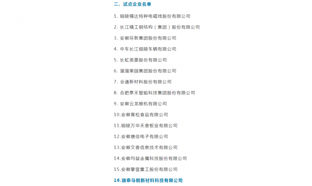 近日,安徽省发改委制发通知,经各地推荐、第三方评估论证,确定16个区域、24个企业为首批全省先进制造业和现代化服务业融合发展试点单位。瑞泰马钢新材料科技有限公司荣登试点企业榜单。