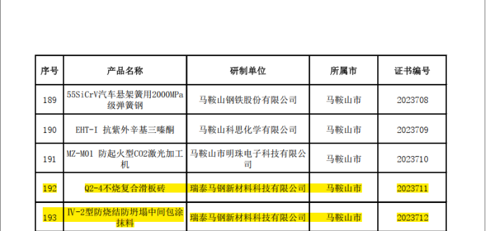 近日,安徽省经信厅发布《关于确认安徽省新产品(2023年第四批)认定名单》,经评定,瑞泰马钢新材料科技有限公司“Q2-4不烧复合滑板砖”、“Ⅳ-2型防烧结防坍塌中间包涂抹料”2项产品成功入选。