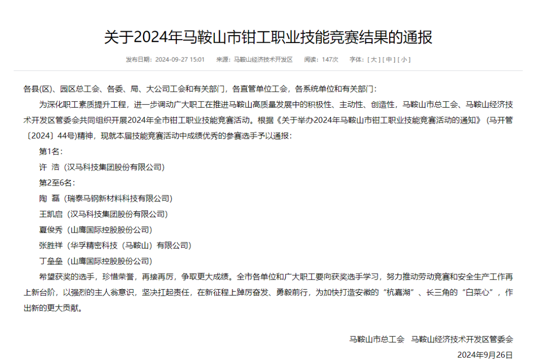 9月21日至9月22日,由马鞍山市总工会、马鞍山经开区管委会主办的2024年马鞍山市钳工职业技能竞赛活动在马鞍山师范高等专科学校开赛,全市众多企业派出近百名实力选手参与角逐。