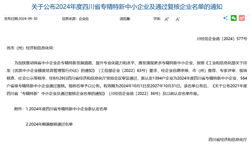 近日,四川省工业和信息化厅公布了《关于公布2024年度专精特新中小企业及通过复核企业名单的通知》,都江堰瑞泰科技有限公司经过成都市初审推荐、合规性审核、专家评审和公示等程序,凭借近年来创新发展良好成效、优秀技术研发能力、成长潜力以及在精细化领域的突出表现,成功被认定为四川省专精特新中小企业。