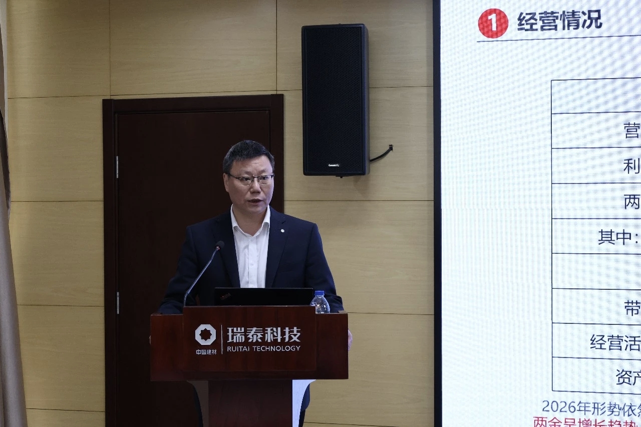 4月15日,瑞泰科技召开2026年度一季度经营工作会议,会议深入贯彻落实公司2026年整体工作总要求,全面总结一季度重点工作推进情况,对标年度目标查找差距不足,系统部署下阶段核心工作任务,凝聚全员共识、聚焦提质增效,推动公司各项重点工作按时间节点,高质量落实落地,为全年经营目标达成筑牢基础。中国建材总院党委副书记、总经理侯涤洋出席会议并作重要讲话。公司领导班子成员出席会议,瑞泰科技党委委员、副总经理白雪松主持会议。