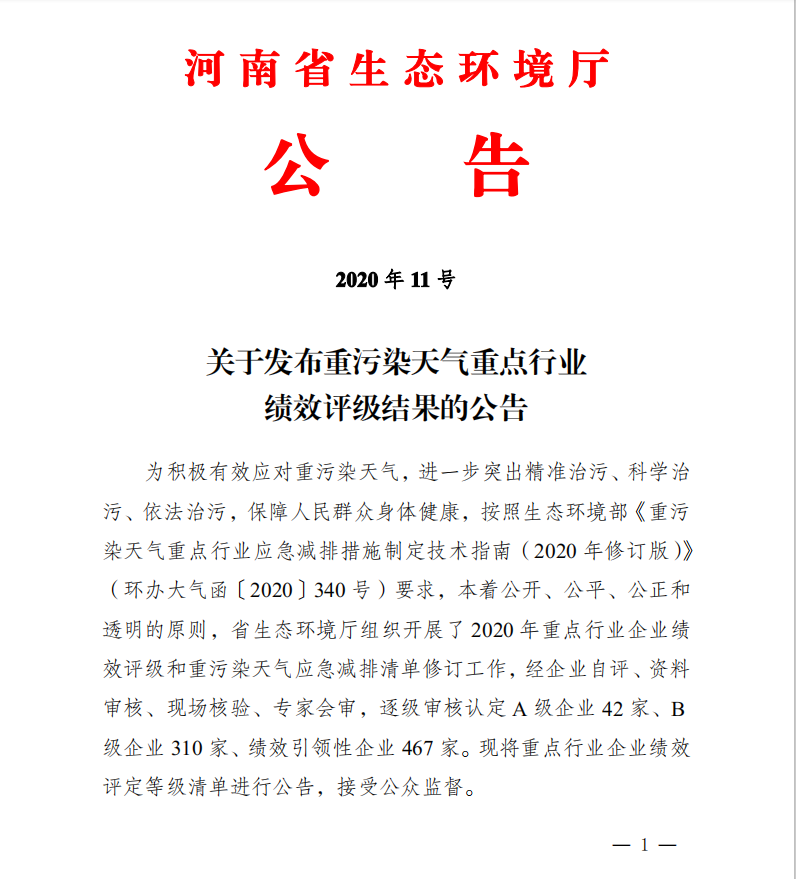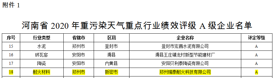 郑州瑞泰再添喜讯,荣获“重污染天气重点行业绩效评级A级企业”