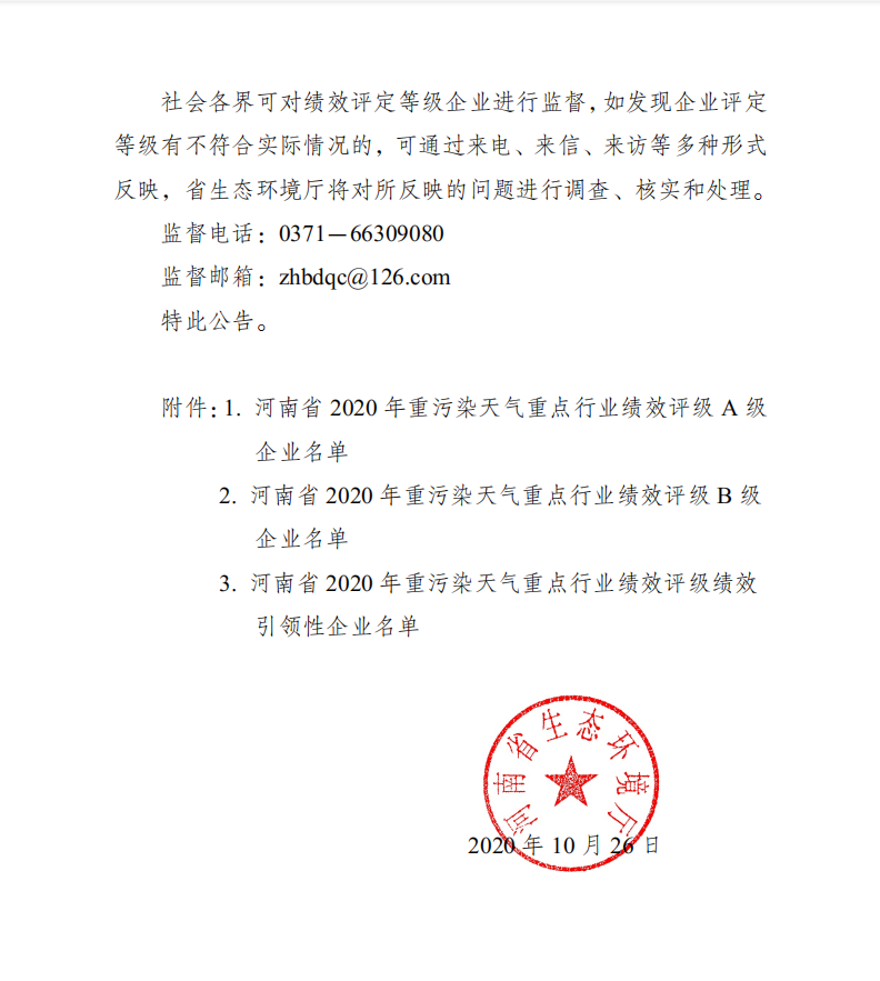 10月26日,河南省生态环境厅发布了2020年重污染天气重点行业绩效评级结果的公告。郑州瑞泰耐火科技有限公司名列其中,成功获得“A级企业”荣誉称号,成为全省入选的耐材企业之首。这是公司继获得国家级“绿色工厂”、省级“绿色引领企业”荣誉称号之后的又一殊荣!