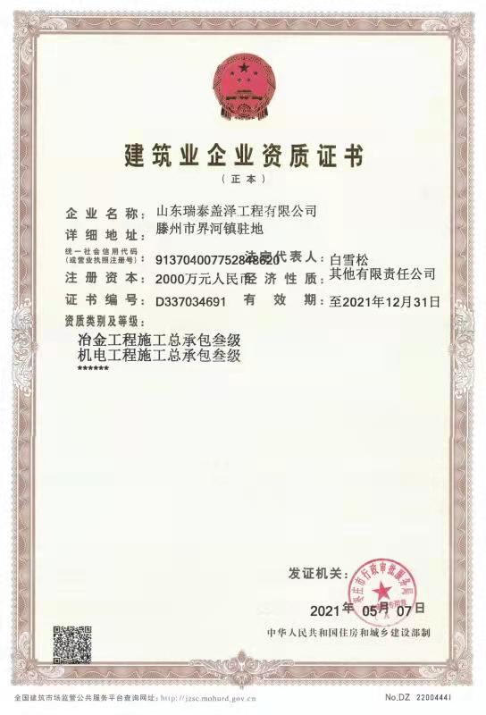近日,山东瑞泰盖泽工程有限公司获得了由枣庄市住房和城乡建设局颁发的机电工程施工总承包叁级资质证书,目前瑞泰盖泽已经具备工程施工双资质(冶金工程施工总承包叁级资质、机电工程施工总承包叁级资质)。