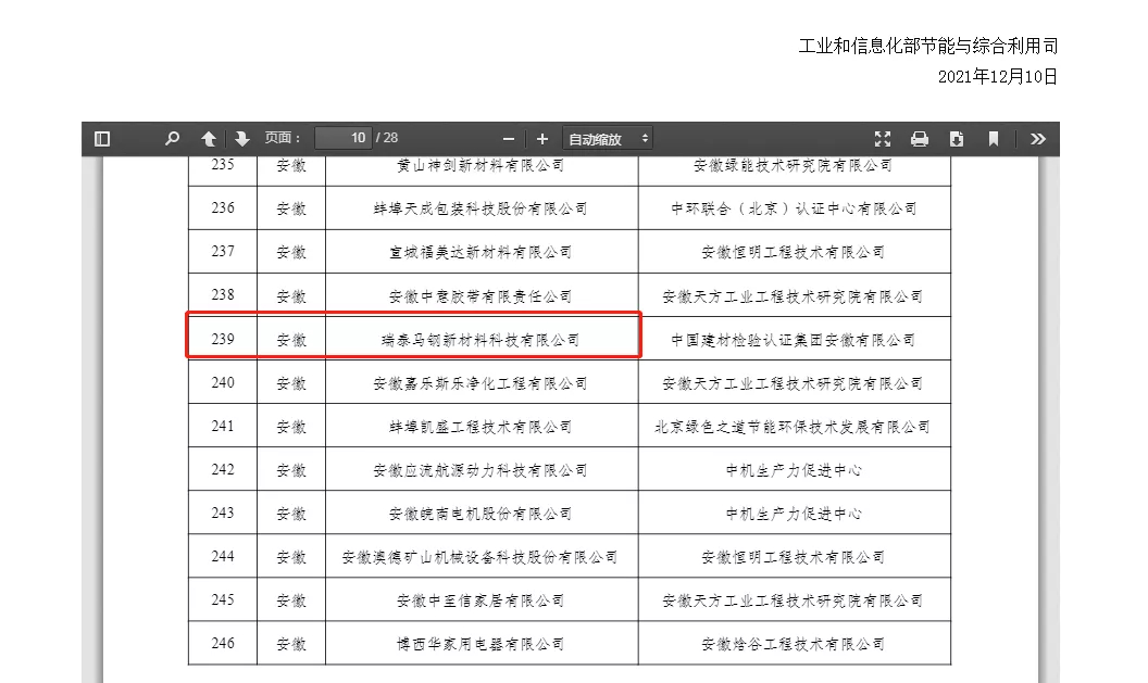 按照《工业和信息化部办公厅关于开展绿色制造体系建设的通知》(工信厅节函〔2016〕586号,以下简称《通知》)明确的推荐程序,参照前五批绿色制造名单推荐工作要求,各省市、自治区、有关协会等开展申报工作。参照《绿色工厂评价通则》(GB/T36132-2018)及《通知》中绿色工厂评价要求,各地区推荐绿色工厂应与已有绿色工厂绿色制造水平指标进行对标,能耗水平等主要指标应优于本地区同行业已有绿色工厂。经过评比,最终瑞泰科技成员企业瑞泰马钢成功入选工信部2021年度绿色制造(绿色工厂)公示名单。