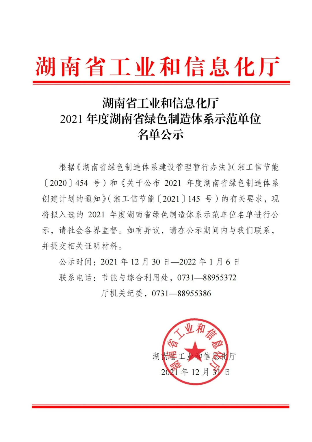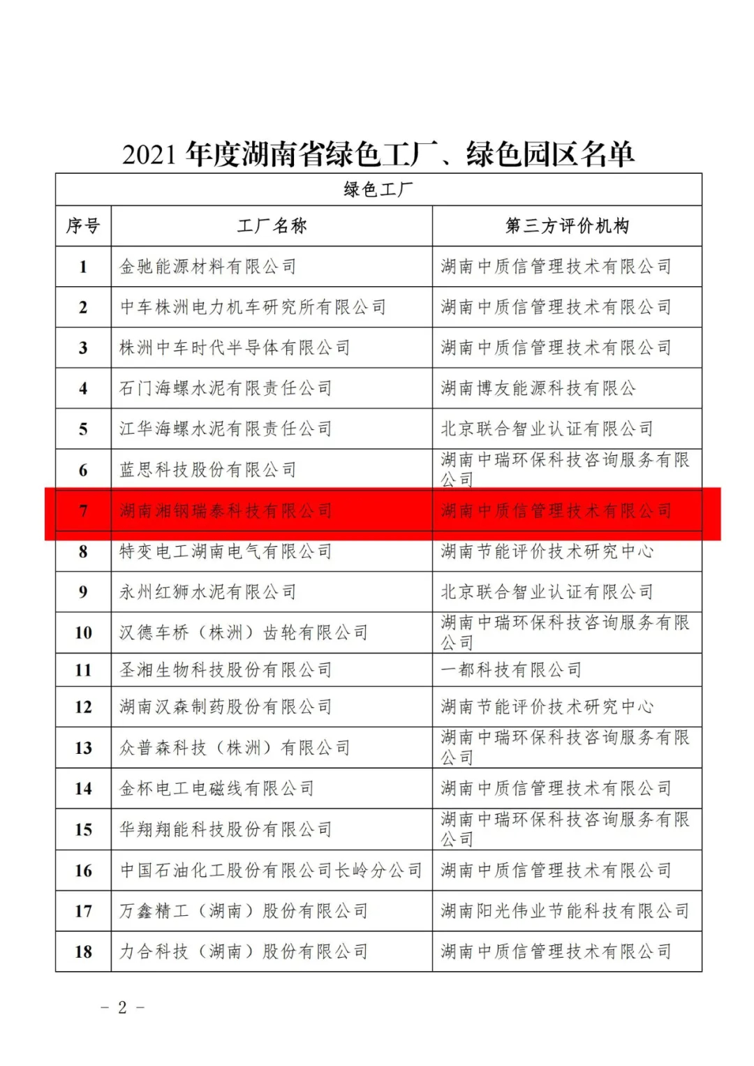 近日,湖南省工业与信息化厅公布了2021年度绿色制造名单,瑞泰科技旗下湖南湘钢瑞泰科技有限公司荣获湖南省“绿色工厂”称号。