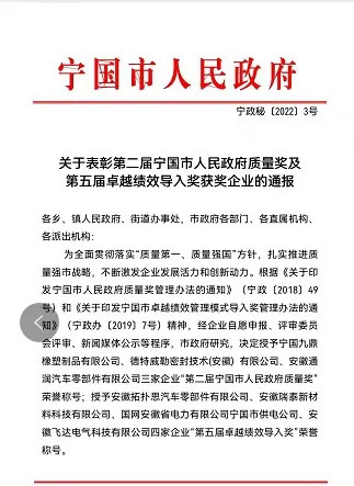 日前,宁国市人民政府发布表彰通报,对荣获第二届市人民政府质量奖和第五届卓越绩效导入奖的七家企业给予表彰。为全面贯彻落实“质量第一、质量强国”方针,扎实推进质量强市战略不断激发企业发展活力和创新动力,根据《关于印发宁国市卓越绩效管理模式导入奖管理办法的通知》(宁政办【2019】7号)精神,经评审委员会,新闻媒体公示等程序,经市政府研究决定,安徽瑞泰成功获得“第五届卓越绩效导入奖”荣誉称号。