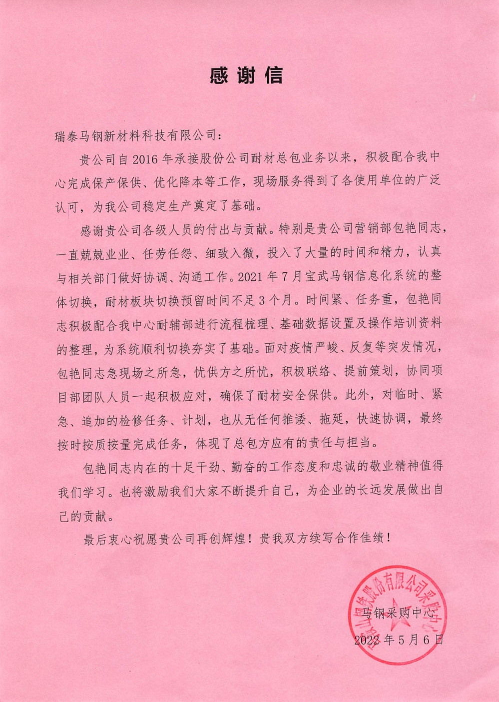 5月7日,马钢采购中心为瑞泰马钢送来了感谢信,致谢瑞泰马钢自2016年承接马钢股份公司耐材总包业务以来积极配合采购中心保产保供、降本增效做出的卓越贡献。同时,还特别感谢了营销部包艳同志在与采购中心协调、沟通中倾注的高度责任心和过硬工作本领。