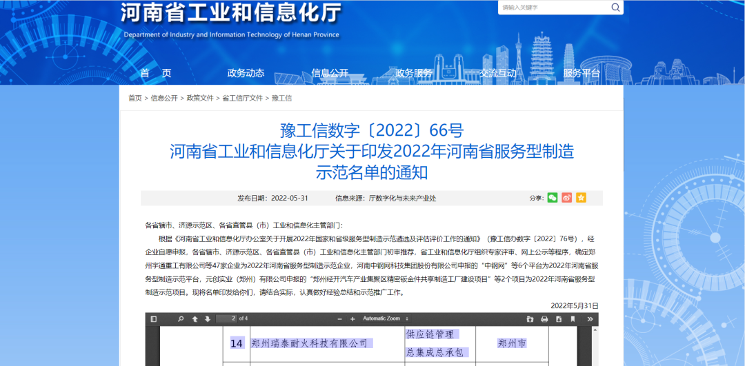 5月31日,河南省工业和信息化厅发布了2022年河南省服务型制造示范企业名单,郑州瑞泰耐火科技有限公司荣获“2022年河南省服务型制造示范企业”称号。
