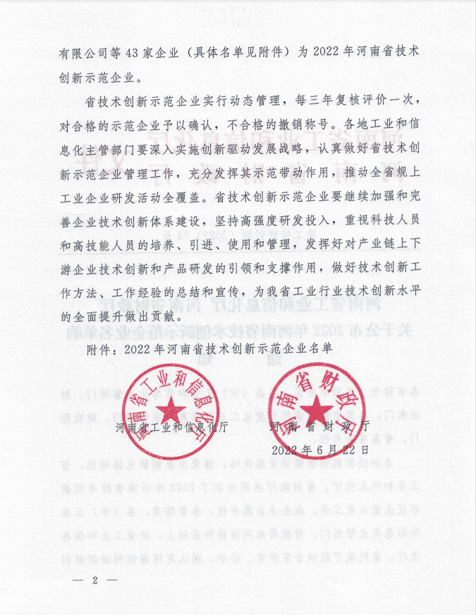 近日,河南省工业和信息化厅发布了豫工信联创新【2022】73号文件文件,河南瑞泰耐火材料科技有限公司被认定为“2022年河南省技术创新示范企业”。