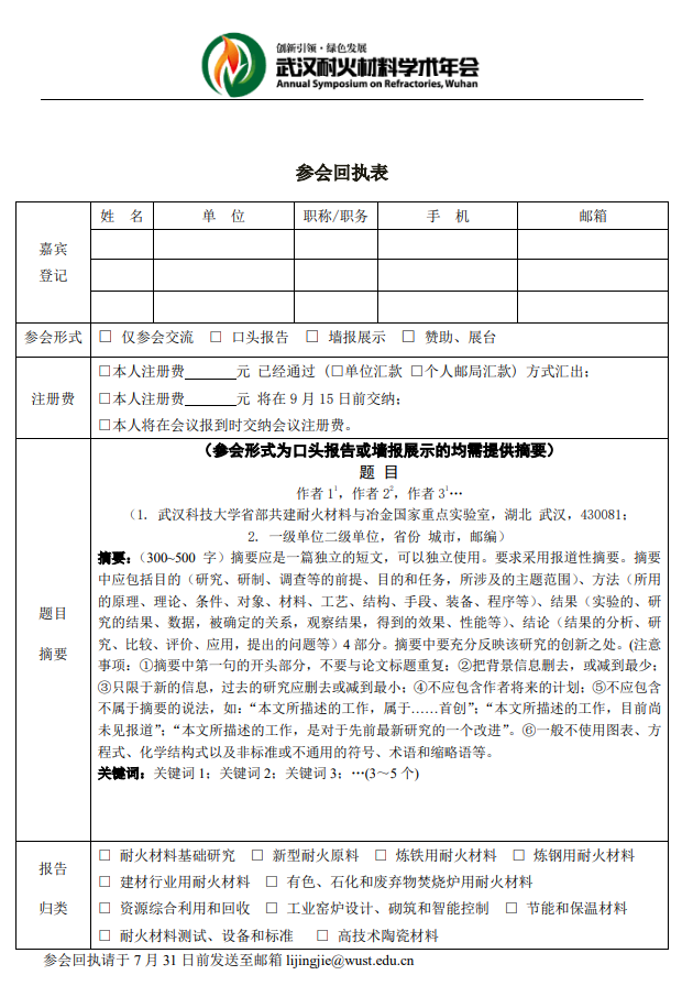 2. 会议出版论文摘要集。会议参会回执表接收截止时间为2022年7月31日,请参会代表将参会回执发至lijingjie@wust.edu.cn。组委会将综合大会安排和摘要质量,优先根据作者的意愿安排论文的展示方式。