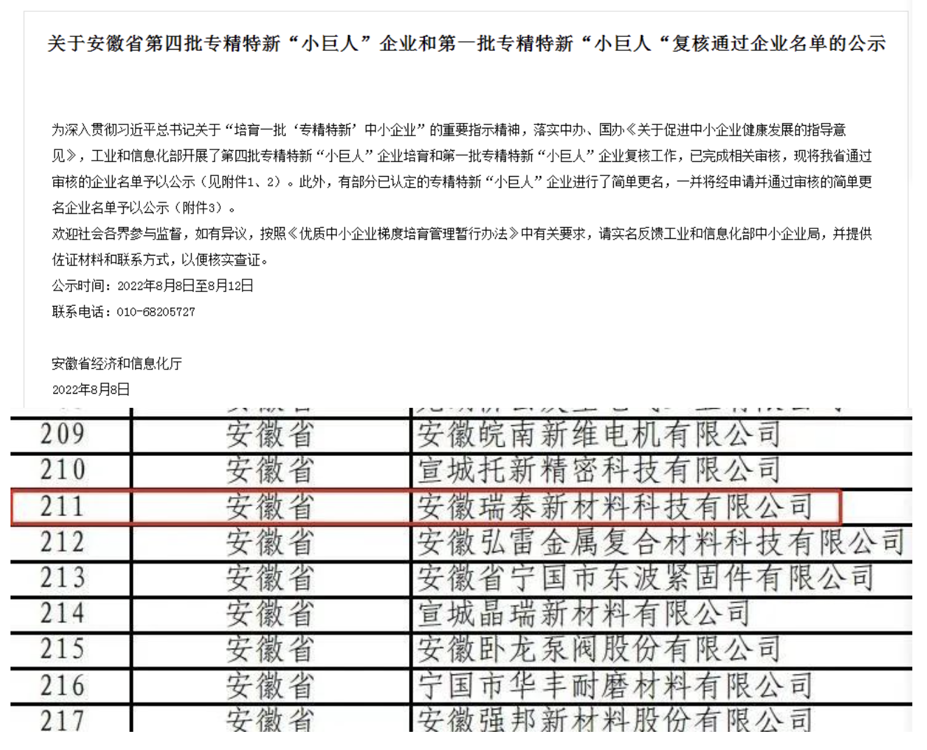 2022年8月,安徽省经济和信息化厅公示了《第四批专精特新“小巨人”企业》,经审核推荐、专家评审、社会公示等程序,安徽瑞泰荣获国家级专精特新“小巨人”企业称号。
