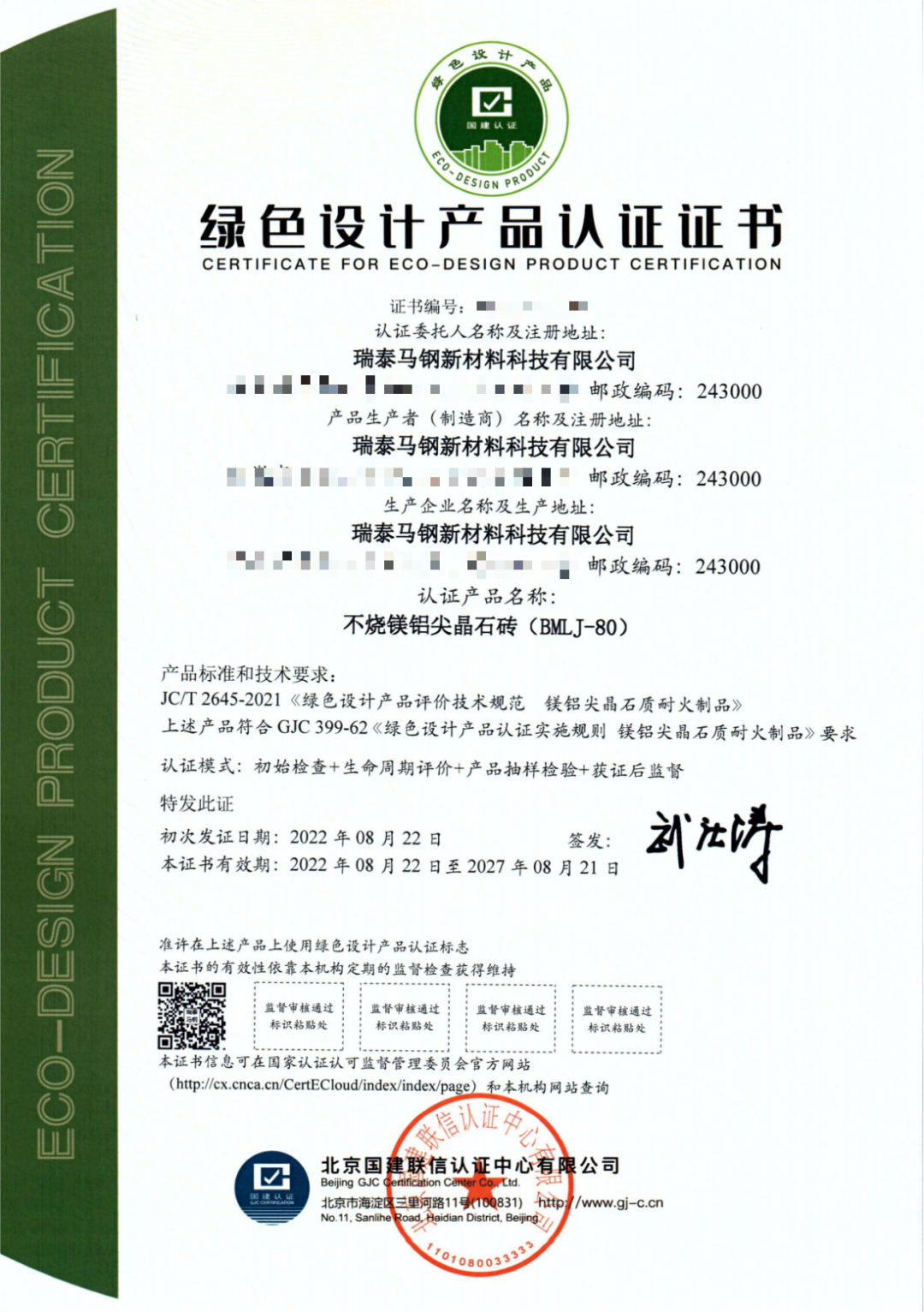 近日,国建联信认证中心向瑞泰马钢新材料科技有限公司颁发了耐火材料行业首张绿色设计产品认证证书,获证产品为不烧镁铝尖晶石砖(型号:BMLJ-80)。