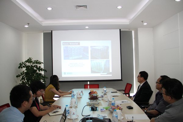佟立金总经理代表瑞泰科技向本次对瑞泰总部及各相关生产基地进行考察的韩国玻璃新老朋友们表示了欢迎,向客人介绍了瑞泰科技的业务范围,以及近年来瑞泰科技在玻璃窑耐火材料成套供货方面取得的业绩。客人对瑞泰依托于中国建材院的技术优势以及耐火材料配套供货的能力表示赞赏,双方在一起就玻璃窑耐火材料节能配置进行了交流与讨论,并期待在完成对生产基地的考察后能很快开启双方未来的合作。