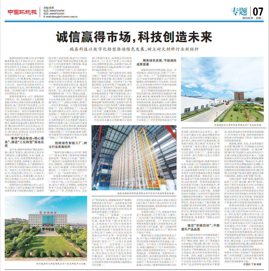 3月29日,《中国环境报》第7版以《诚信赢得市场 科技创造未来——瑞泰科技以数字化转型推动绿色发展,树立耐火材料行业新标杆》为题报道了瑞泰科技积极推进“三化转型”、创建智能工厂、聚焦绿色发展的故事。