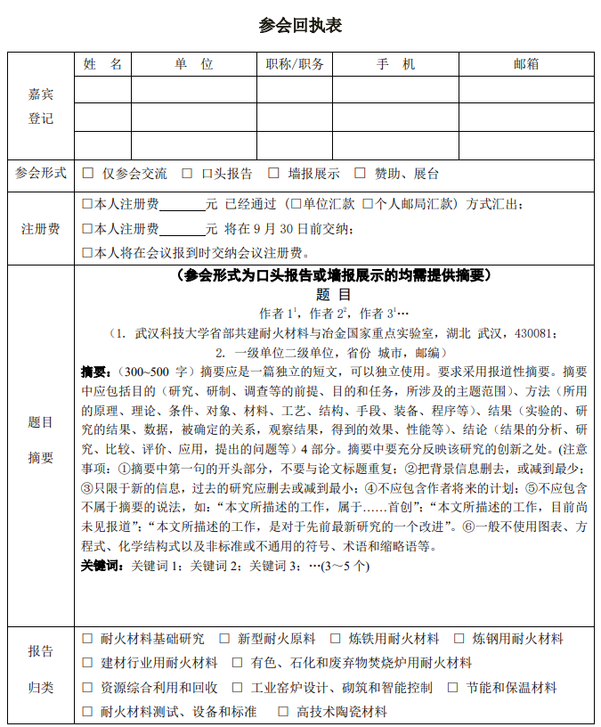 参会回执请于8月31日前发送至邮箱lijingjie@wust.edu.cn