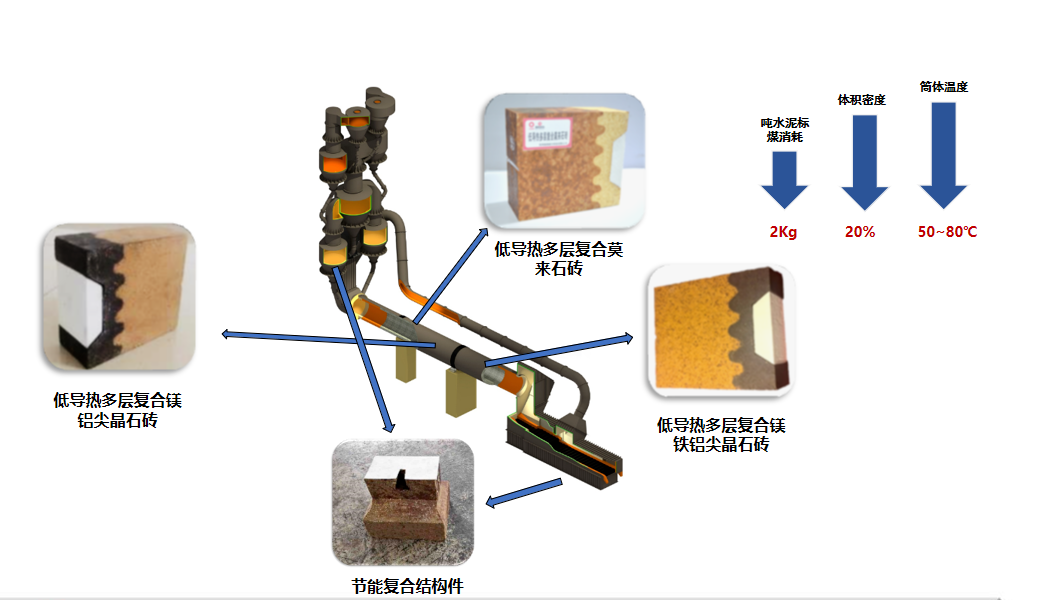 项目针对水泥行业碳排放较高的问题,充分研究了水泥窑不同区域热量散失的问题,分析了水泥窑中不同耐火材料的使用效果和使用情况。采用梯度复合设计技术制备水泥窑用系列低导热复合耐火材料,针对影响水泥窑散热的关键部位水泥窑窑体、内衬高温烧成带、水泥窑中不定型部位,分别发明出节能复合砖、低导热镁铁铝复合尖晶石砖、节能复合结构件等多种节能高温产品较好地解决了水泥窑散热损失高的行业难题。通过减碳节能高温材料的迭代创新与应用,降低了水泥窑碳排放,节能减碳效益显著。