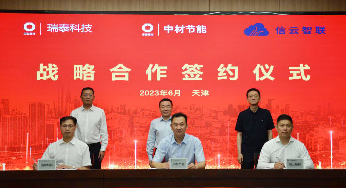 6月12日,瑞泰科技与中材节能、信云智联在天津中材节能总部,三方就智慧能源领域进行了深入的交流,并签署“智慧能源战略合作协议”。中材节能党委书记、董事长孟庆林,中国建材总院副总经理、瑞泰科技党委书记、董事长宋作宝,信云智联董事长陈刚见证签约。中材节能副总裁、董事会秘书、总法律顾问黄剑锋,瑞泰科技副总经理陈荣建,信云智联总经理王乔晨代表三方签字。根据协议,三方将在绿色低碳、数字智能、协同创新等领域开展全面深入的合作。