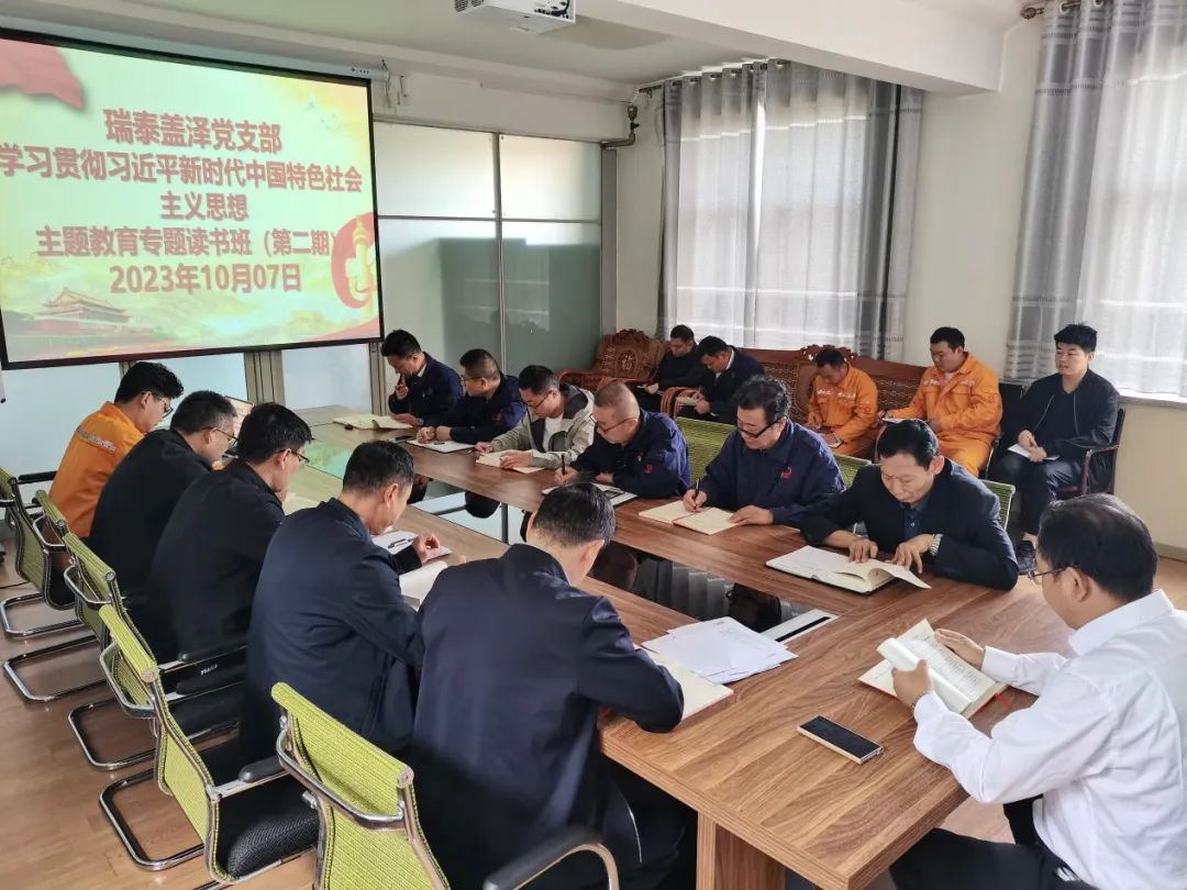 主题教育开展以来,瑞泰盖泽党支部按照学习计划要求组织领导班子成员、全体党员、预备党员、入党积极分子参加主题教育专题读书班并交流发言。与会人员围绕加强党的领导和党的建设、全面从严治党、科技创新等主题,结合工作实际进行研讨,分享学习体会,交流工作方法和举措,积极为公司高质量发展建言献策。进一步加深了党员干部对习近平新时代中国特色社会主义思想的科学体系、核心要义、实践要求的理解把握,将主题教育理论学习与企业发展相结合,公司全体员工坚定信心,统一思想,推动企业实现高质量发展。