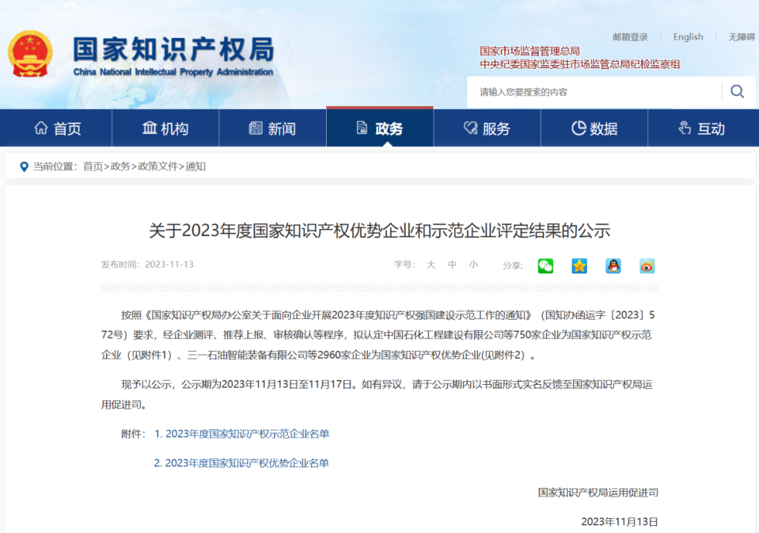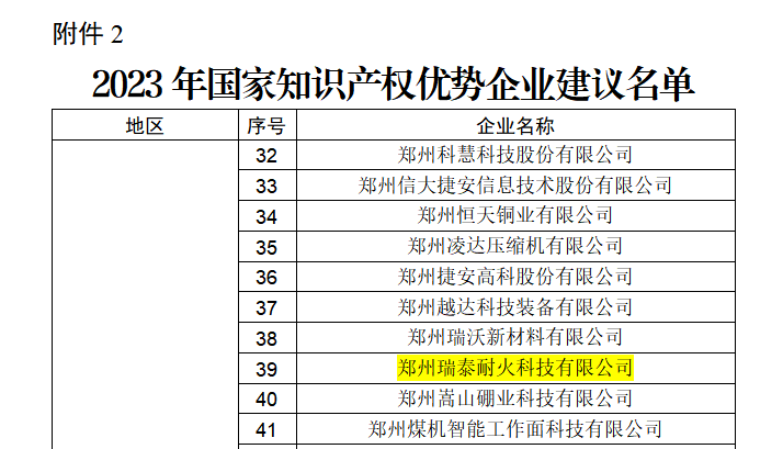 近日,国家知识产权局公布《关于2023年度国家知识产权优势企业和示范企业评定结果的公示》名单,郑州瑞泰成功入选。