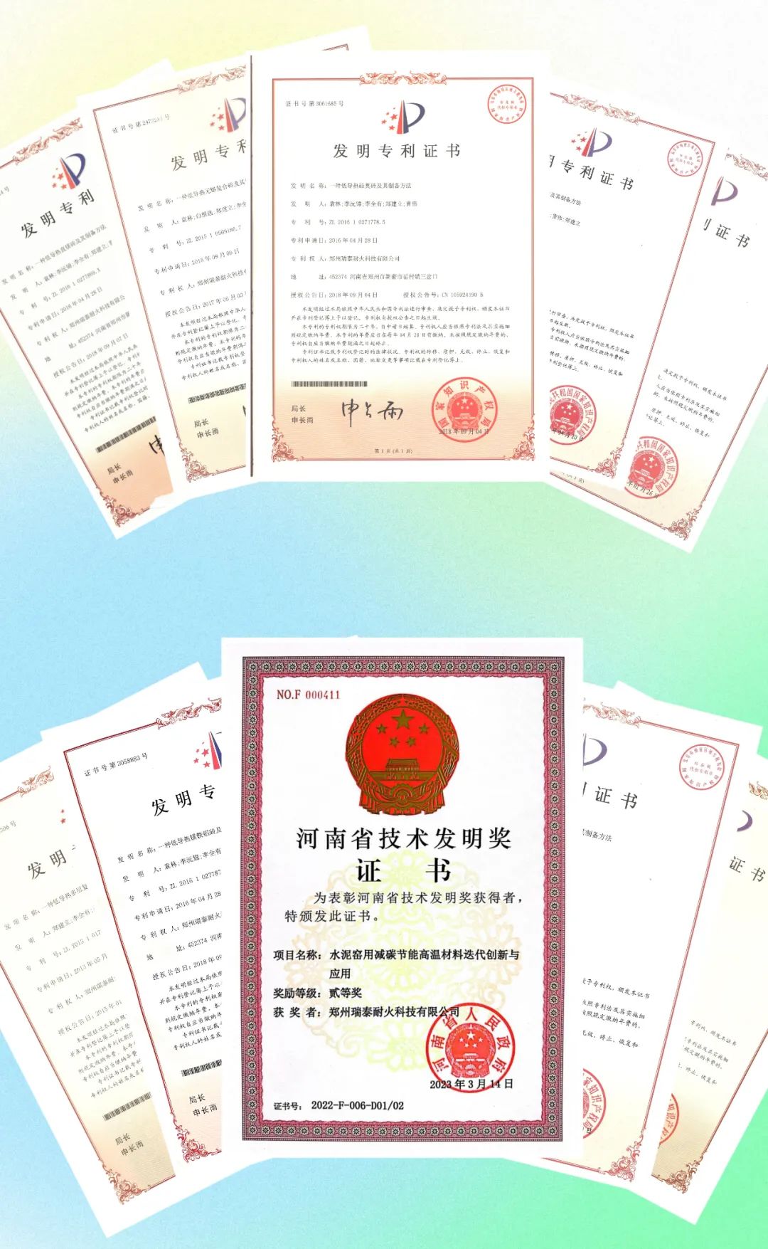 郑州瑞泰深知创新是引领发展的第一动力,保护知识产权就是保护创新。近年来公司的多项产品荣获“河南省技术发明二等奖”、“河南省科技进步三等奖”、“中国材料研究学会科技创新二等奖”、“中国建材联合会科技进步二等奖”。其中“低导热镁铁铝复合尖晶石砖”经中国建筑材料联合会鉴定达国际先进水平;“节能复合耐火材料结构件”经中国建筑材料联合会鉴定达到国际领先水平。公司已申请国家发明专利39多件,授权国家发明专利19件和实用新型6件,外观设计专利8件,主持及参与16项国标、行标、团体标准的修订。知识产权创造、运用、保护、管理能力全面发展,知识产权综合竞争优势突出。