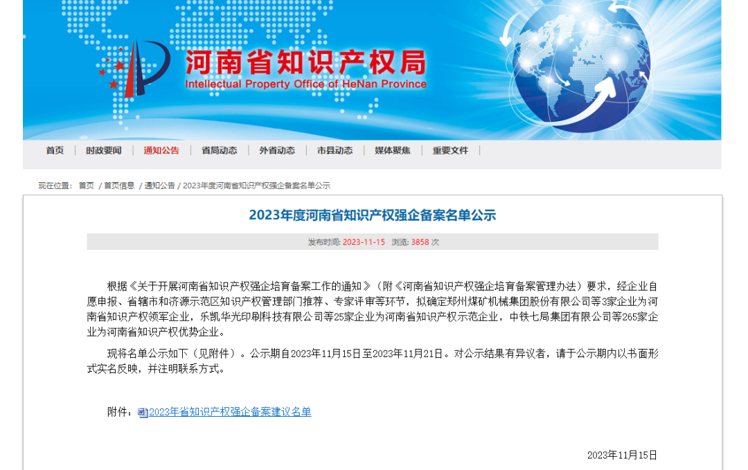 日前,河南省知识产权局公布了“2023年度河南省知识产权强企备案名单”,河南瑞泰被评为河南省知识产权优势企业。这是继成为“郑州市知识产权优势企业”后,在知识产权领域获得的又一项荣誉。
