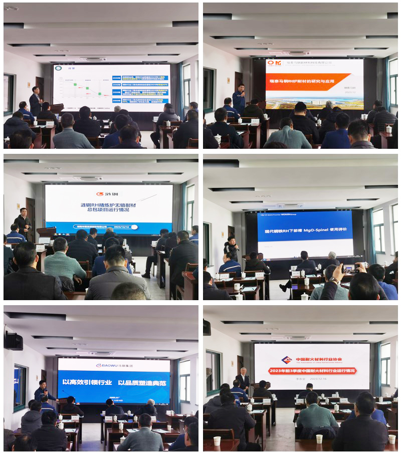在技术交流会上,来自武汉科技大学李亚伟教授作了题为《“双碳”背景下耐火材料机遇与挑战》,报告了耐火材料行业在“碳达峰”和“碳中和”等双碳政策背景下发展趋向。瑞泰马钢科技质量部部长崔任渠作了题为《洁净钢精炼炉用环保耐火材料的研发与应用》,对瑞泰马钢RH系列产品研究进展和应用情况作了详细介绍。涟钢技术中心首席专家隋亚飞博士围绕涟钢RH耐材总包服务案例,作了题为《涟钢RH精炼炉无铬耐材总包项目运行情况》的报告,详细介绍了RH精炼炉无铬耐材总包项目模式及运行效果,分析了钢铁企业当下RH耐材的发展需求。韩国现代制铁朴虎山科长作了题为《现代制铁 RH MgO-Spinel 实际评价结果》,高度评价了瑞泰马钢新型环保结合型RH MgO-Spinel砖的环保改善及使用情况。马钢集团炉外精炼技能大师单永刚作了题为《马钢四钢轧300吨RH炉产能释放耐材的支撑保障》专题报告,介绍了无铬化耐材保障马钢四钢轧RH产能释放的举措,对RH绿色环保无铬化耐材全面推进炼钢高质量发展给予高度肯定。最后,由中国耐火材料行业协会副会长李永全先生作了题为《2023年前三季度中国耐火材料行业运行情况》的报告。分析了前三季度耐火材料行业运行现状及特点,解读了钢铁行业下行周期下对耐火材料需求总量的影响,并对2024年耐火材料行业发展作了展望。