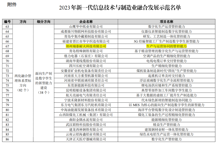 近日,工信部公示2023年新一代信息技术与制造业融合发展示范名单,其中在两化融合管理体系贯标方向,郑州瑞泰耐火科技有限公司申报的“生产与运营协同的管控能力”项目成功入选。