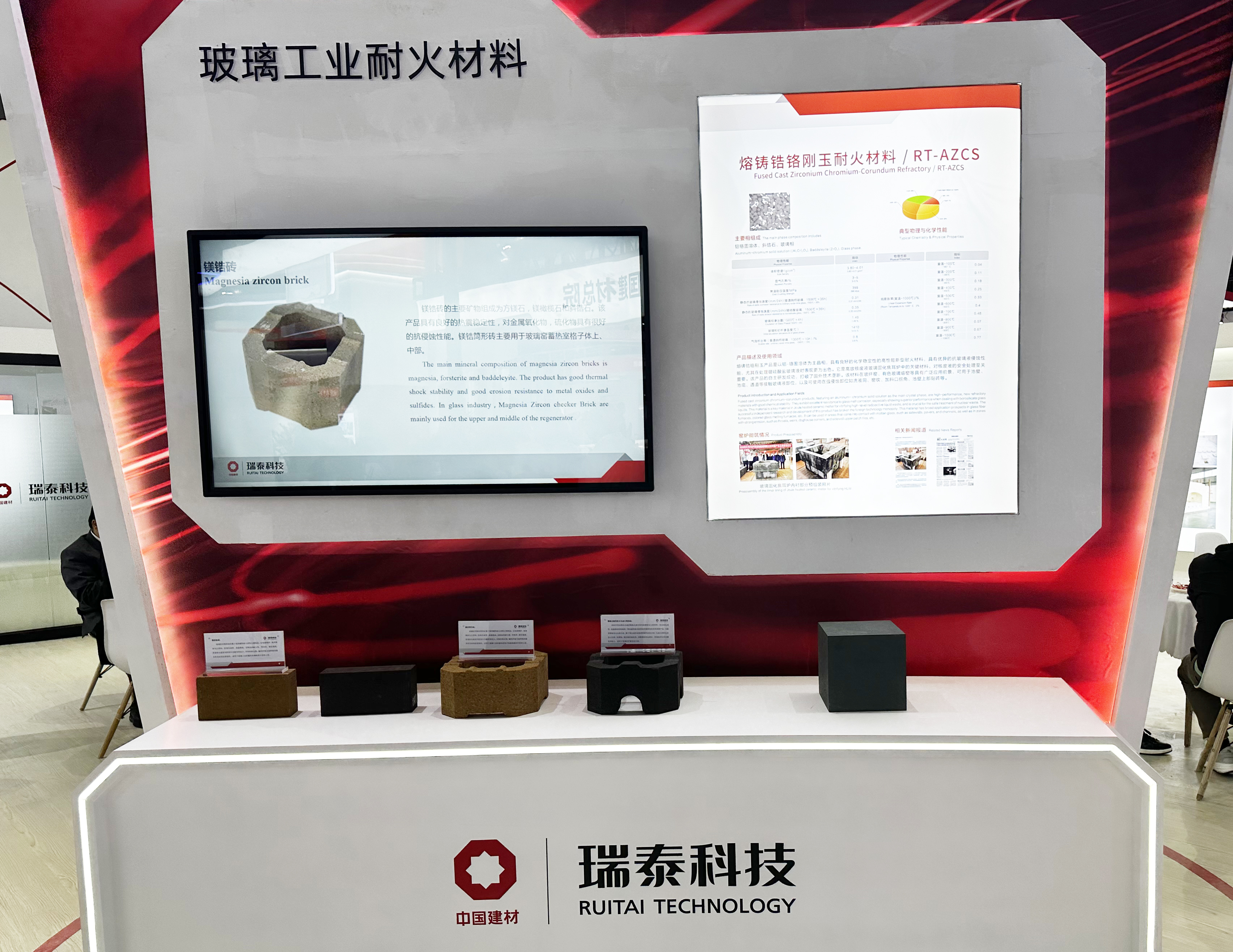 此次玻璃展,瑞泰科技展出了熔铸锆铬刚玉耐火产品和镁质耐火产品。