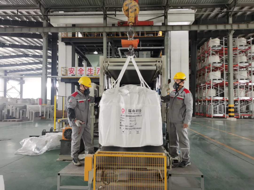 五一期间,安徽瑞泰部分岗位正常开工。图为耐火车间拌料工正在完成打包工序。