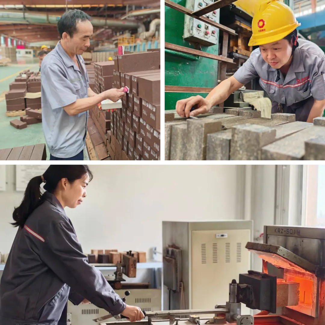 五一期间,多个项目正常推进。左图为华东瑞泰驻抚顺特钢总包项目员工鞠家泉正在进行钢包滑动水口热修作业,右上图华东瑞泰驻天铁总包项目部员工赵子云正在进行滑板烧眼作业,右下图宜兴耐火员工张轩在数控磨床上进行滑板位置固定。