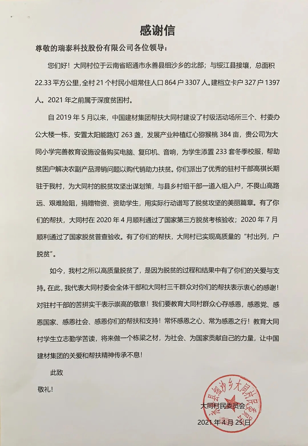 瑞泰科技扶贫点大同村发来感谢信