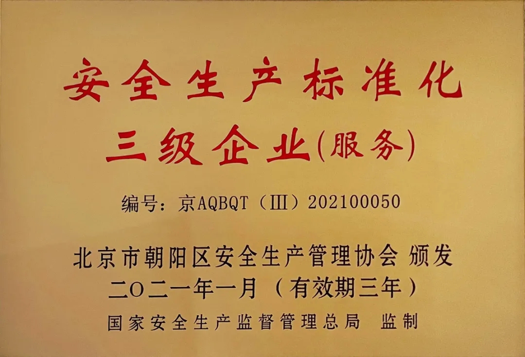 近日,瑞泰科技获得了由国家安全生产监督管理总局监制、北京市朝阳区安全生产管理协会颁发的“安全生产标准化三级企业”证书和牌匾。